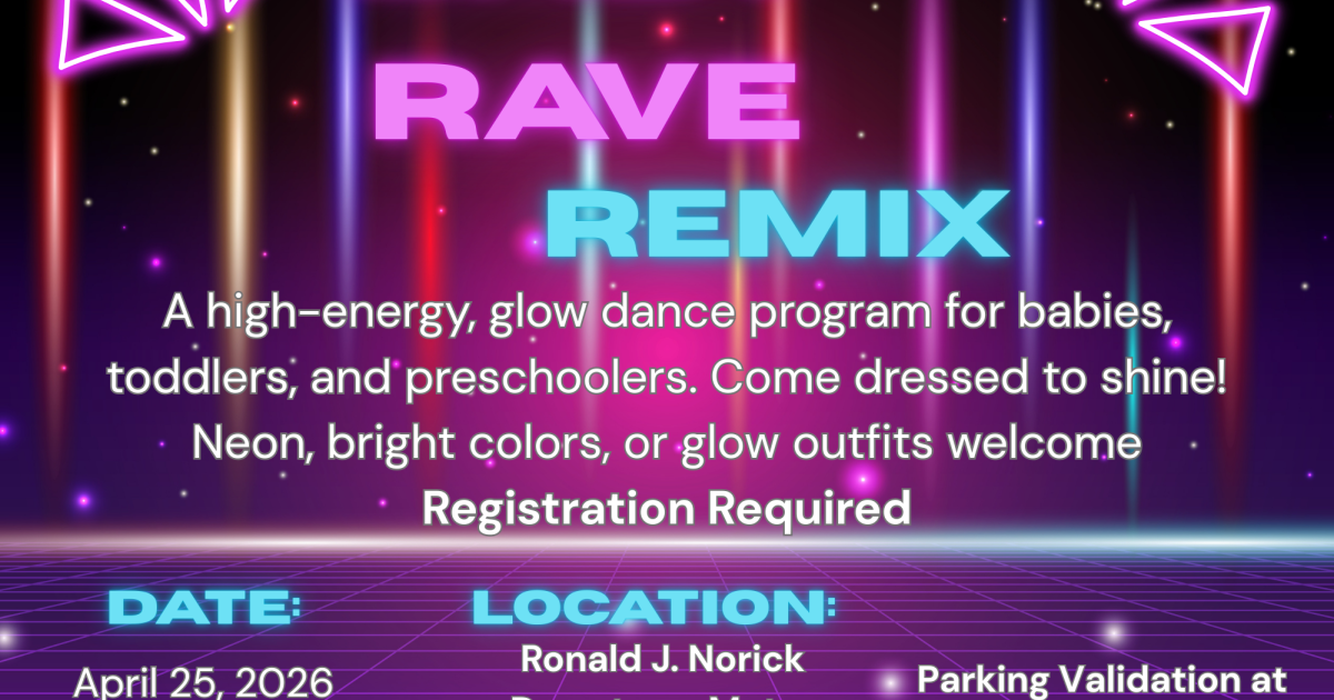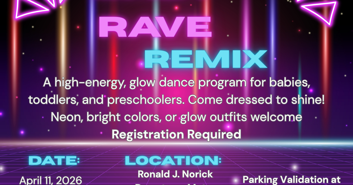 Get ready to glow and go! Join us for Baby Rave Remix, the most adorable dance party your little one will ever attend. We’re turning the library into a mini rave—kid‑style!—complete with colorful lights, bouncy beats, bubbles, and plenty of room for tiny toes to wiggle, wobble, and groove.