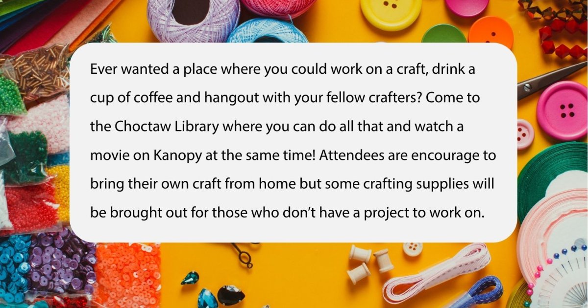 Craving a a community of crafters to hang out with? Do you enjoy creating lack the space? Or do you just want a place where you can sit down and drink a cup of coffee away from the chaos? Come visit the Choctaw Library where you can work on a craft, enjoy community, drink a cup of coffee all while enjoying a movie from our steaming service Kanopy!