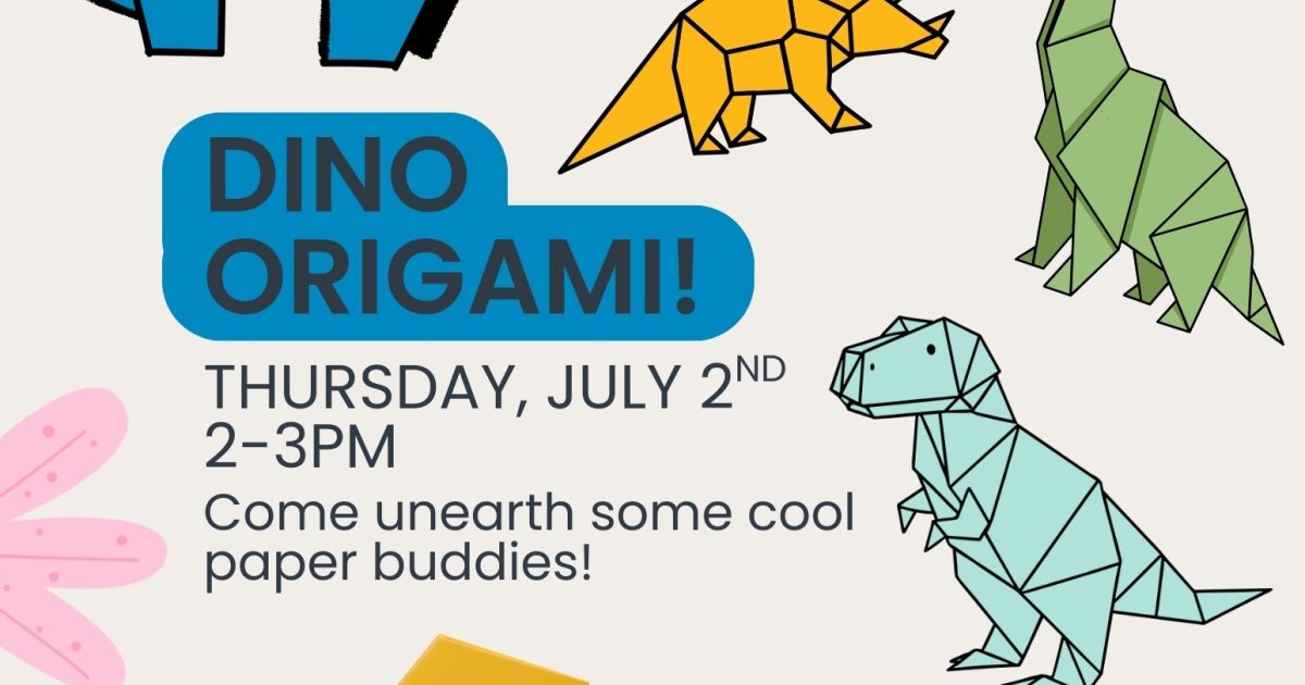 Primary tabs Upcoming List Month Week Day Remind Me Add To My Calendar Print Share Program Type: Arts & Crafts, DIY & Hobbies Age Group: Kids, Teens Program Description Event Description Come Unearth some cool Dino Friends with this paper craft class! Learn how to fold paper into different dinosaur and fun designs.