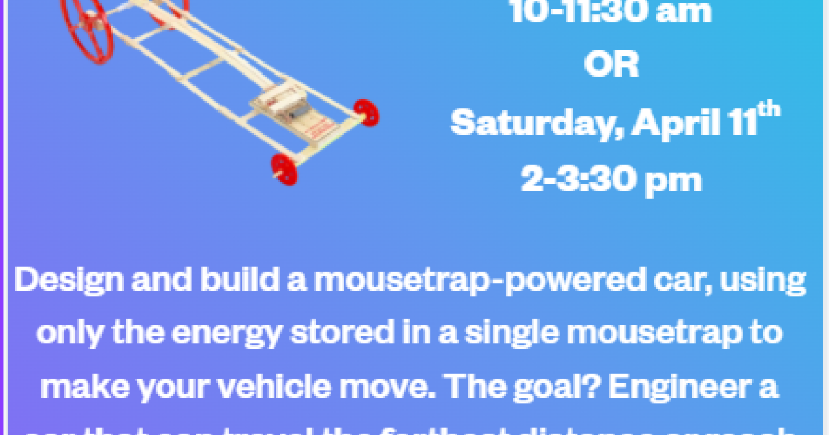 This month, get ready for a high-energy engineering challenge! Students will design and build their own mousetrap-powered cars, using only the energy stored in a single mousetrap to make their vehicle move. The goal? Engineer a car that can travel the farthest distance or reach the greatest speed. Participants will explore the principles of energy, motion, and design while racing to see whose mousetrap car performs the best!