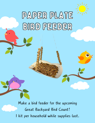 Get ready for this weekend's Great Backyard Bird Watch by making a bird feeder! All the supplies are provided to create a cute place for birds to get a snack. 1 kit per household while supplies last.