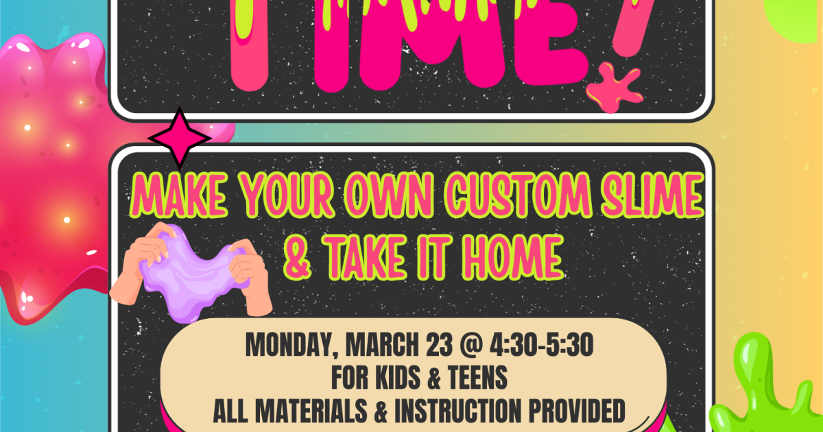 Join us for Slime Time! We will be providing the materials and teaching kids how to make slime. We will have a variety of colors and add-ins to choose from!