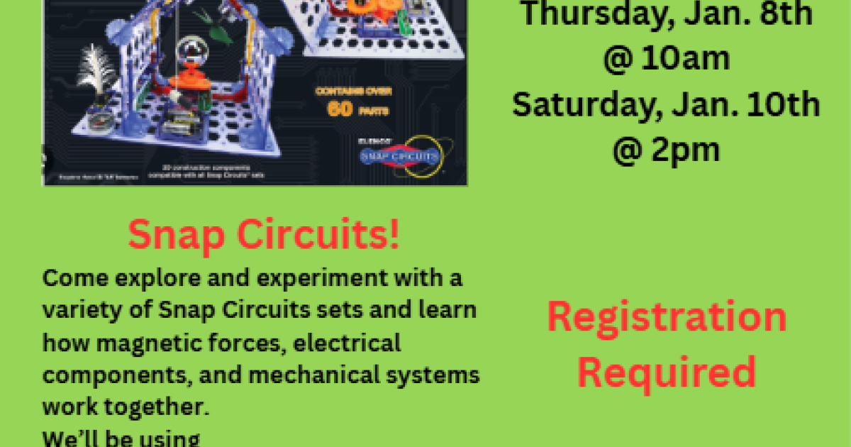 Come explore and experiment with a variety of Snap Circuits sets! Dive into hands-on STEM learning with the Snap Circuits 3D M.E.G. Set—where M.E.G. stands for Magnetic, Electronics, and Gears. Discover how magnetic forces, electrical components, and mechanical systems work together.