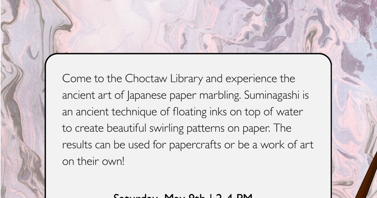 Come to the Choctaw Library and experience the ancient art of Japanese paper marbling. Suminagashi is an ancient technique of floating inks on top of water to create beautiful swirling patterns on paper. The results can be used for papercrafts or be a work of art on their own!