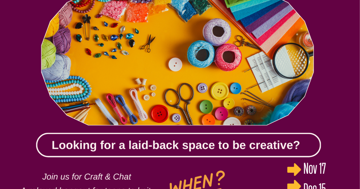 Are you looking for a laid-back space to be creative? Join us for Craft & Chat, where you can work on knitting, crochet, scrapbooking, or any craft you enjoy. Bring your own supplies and projects, or try out a few materials we'll have available. It's a fun, relaxed time to hang out with other teens, share ideas, and enjoy creating something with your hands. No experience needed - just come ready to create and connect.