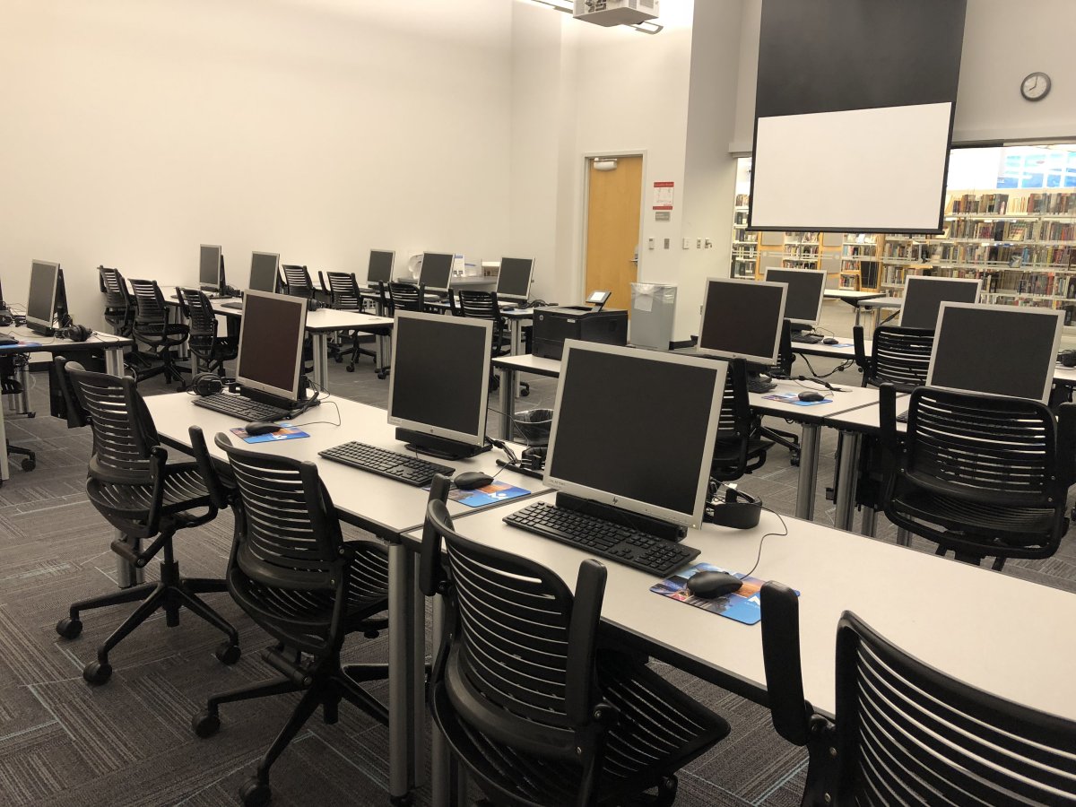 Route 66 Computer Lab with rows of computers and large screen